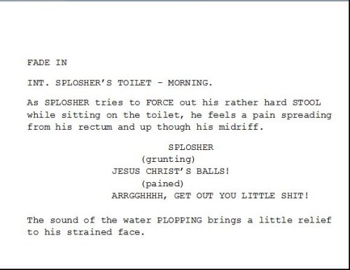 With this in mind then, I must now progress onwards into my second, third and maybe even my fourth script drafts, carving away chunks of utter slop in the hope of garnering perhaps just a single line of pure virtuosity. Of course, I’ll be saving all my off cuts in another Word document, just in case I’m successful in selling the idea for a series and there’s a need for me to dip into this ‘abortion bin’ of excess ideas to stretch out my feeble storyline kernel. I know it sounds a lot like crapping in a big box for years on end and then having to trawl through it for a single turd that dropped out of your arse back in 1999: not really an appetising thought, but we’ve all got to reassess our past shit from time to time, regardless… uh oh, here come the flashbacks!